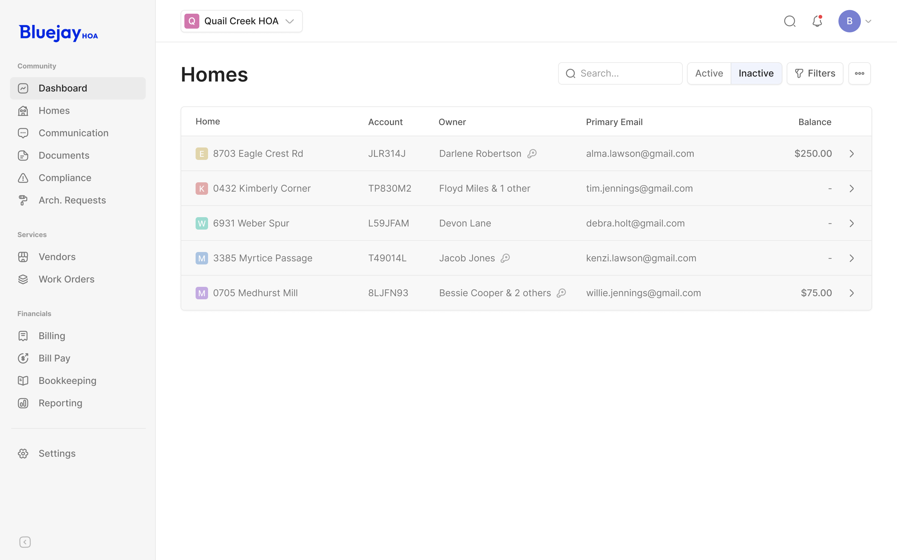 A clean layout showing a list of homes with a sidebar menu. The list includes columns for account, owner, and primary email associated with each home, along with a search bar and filter options.