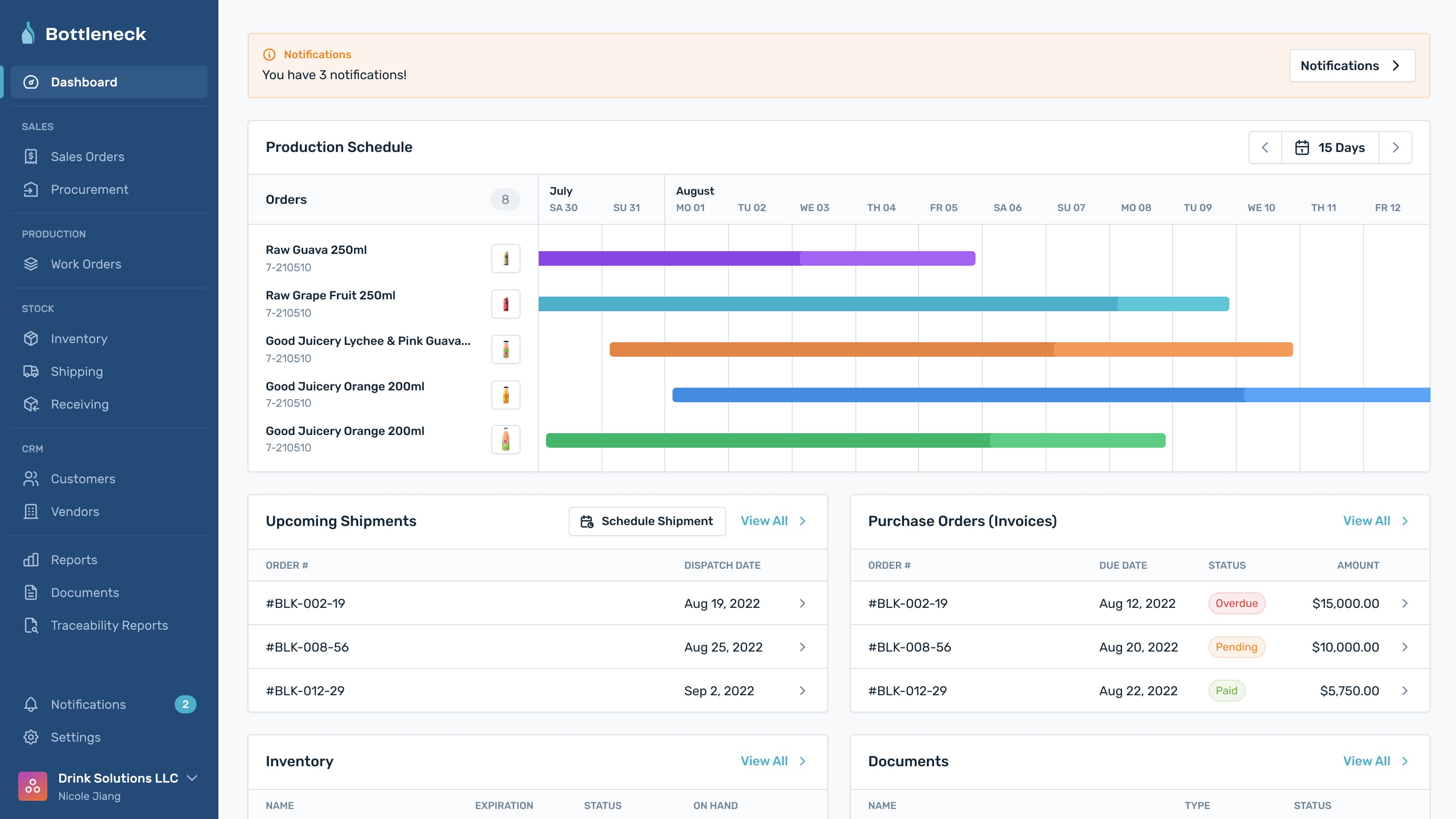 A dashboard for managing the production schedule, featuring a sidebar menu, notifications at the top, and a Gantt chart displaying different product orders.