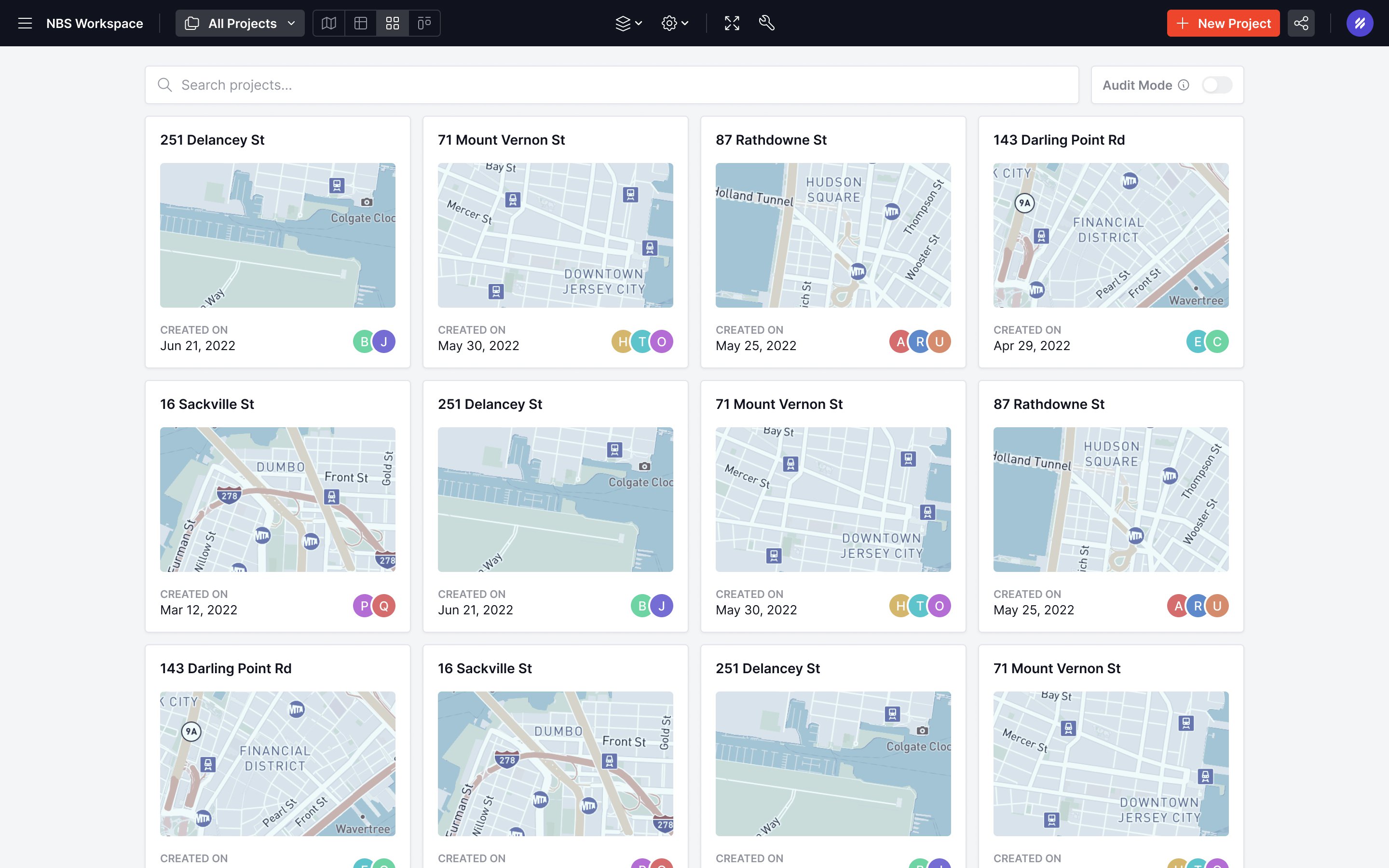 A web page displaying a list of urban projects with map thumbnails and creation dates. Includes search functionality and navigation controls.