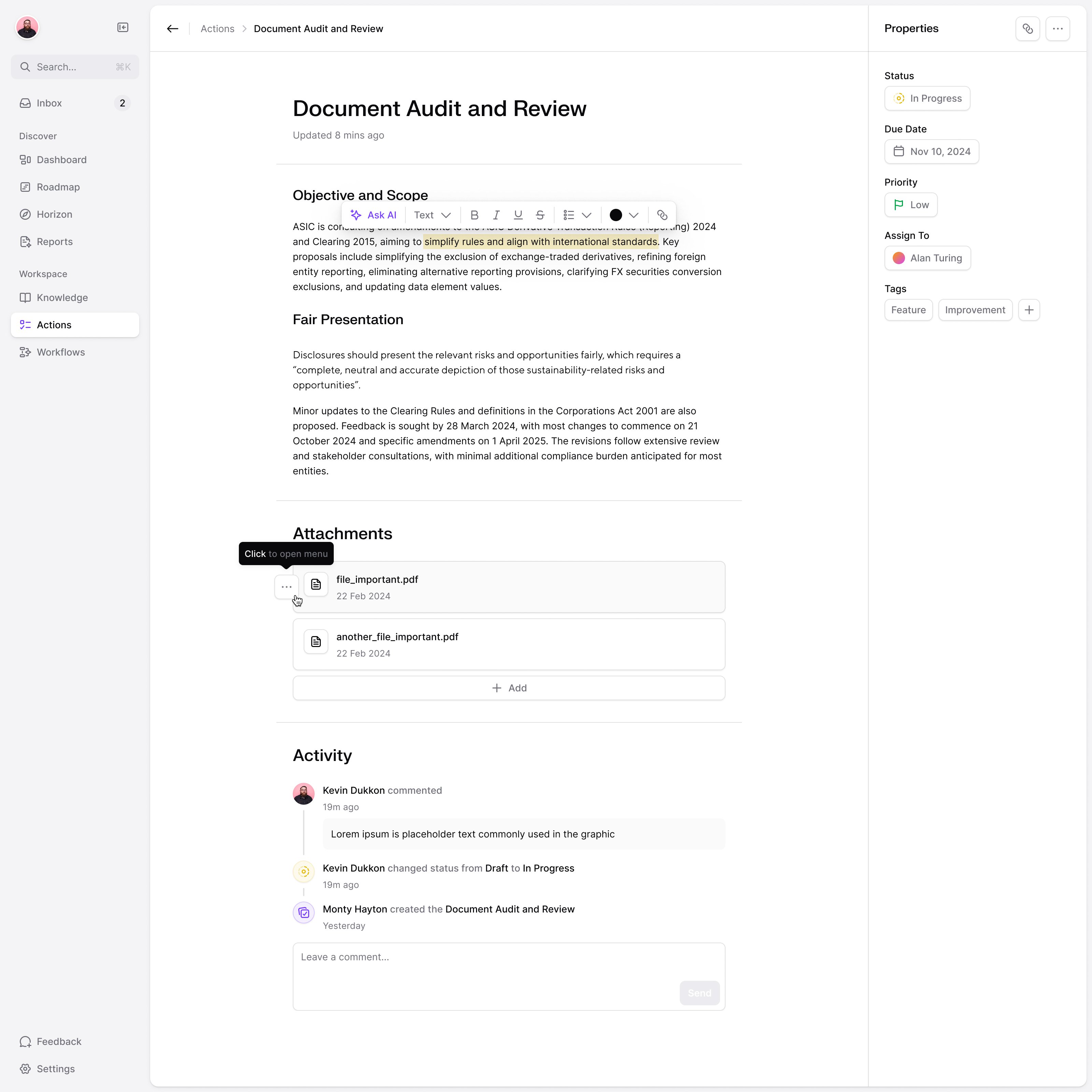 A UI for reviewing and auditing documents with sections for attachments, objectives, and activity log. Includes properties like status, due date, and priority.