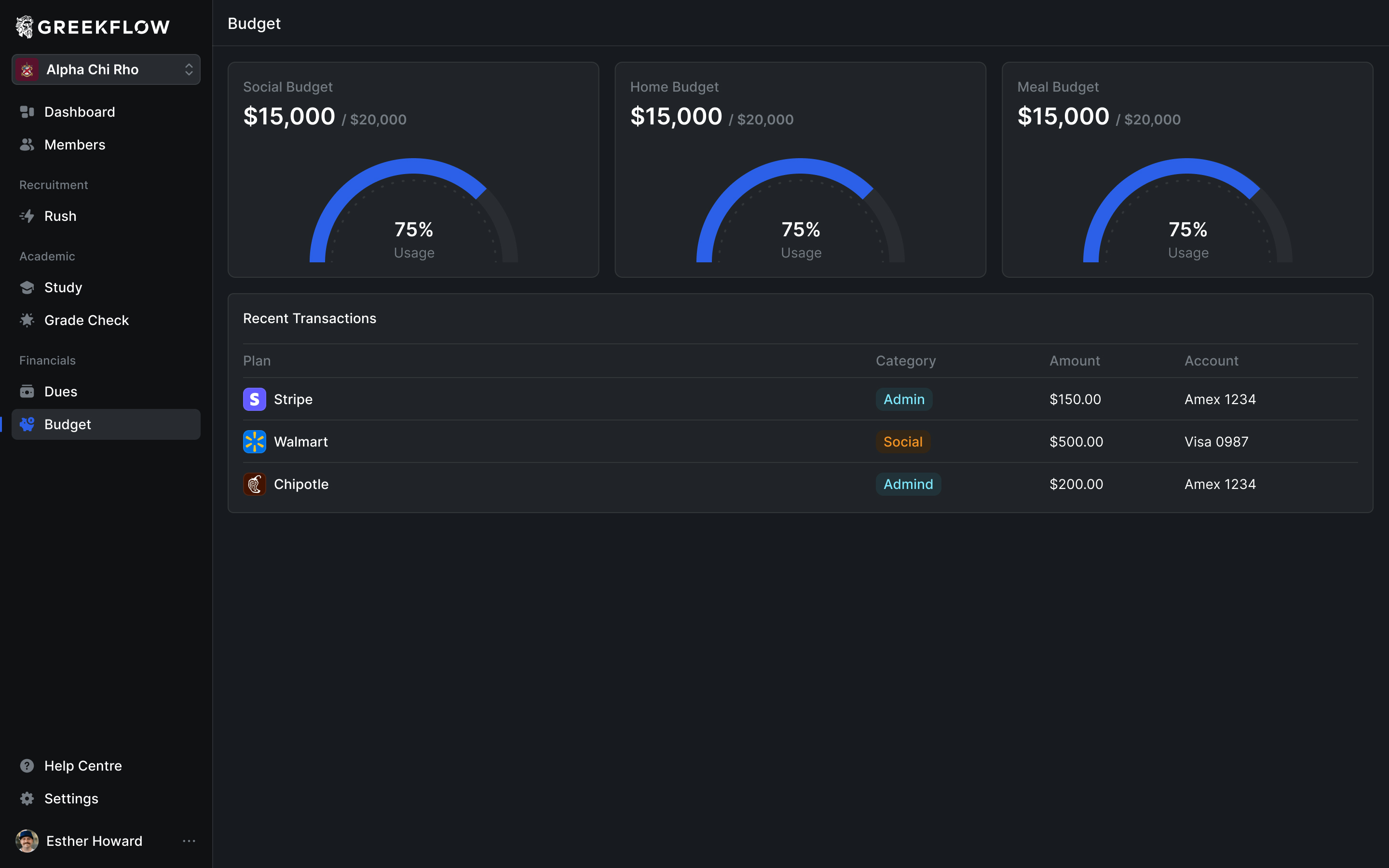 A dark themed dashboard for fraternity/sorority financial management, featuring budget statistics, recent transactions, and a sidebar menu.