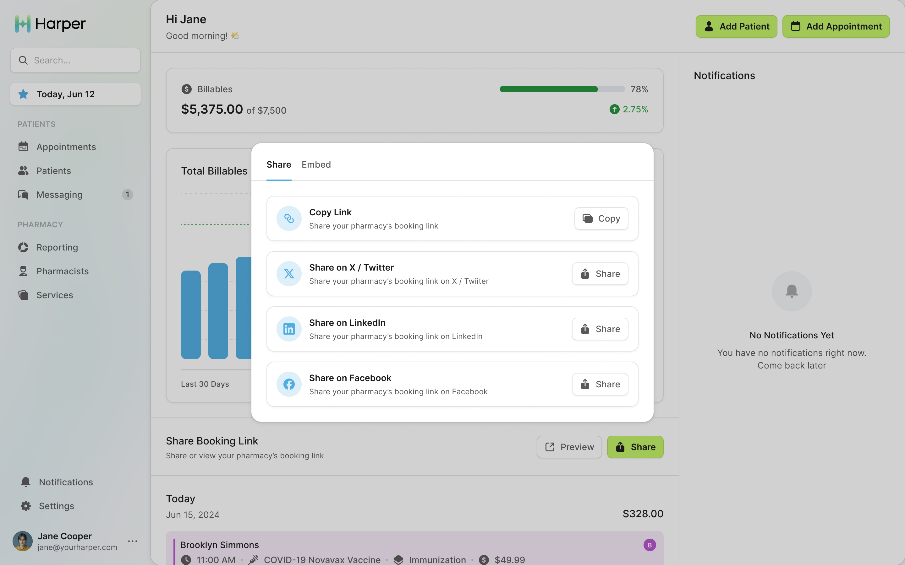 A modal popup for sharing pharmacy booking links with options to share via copy, Twitter, LinkedIn, and Facebook.