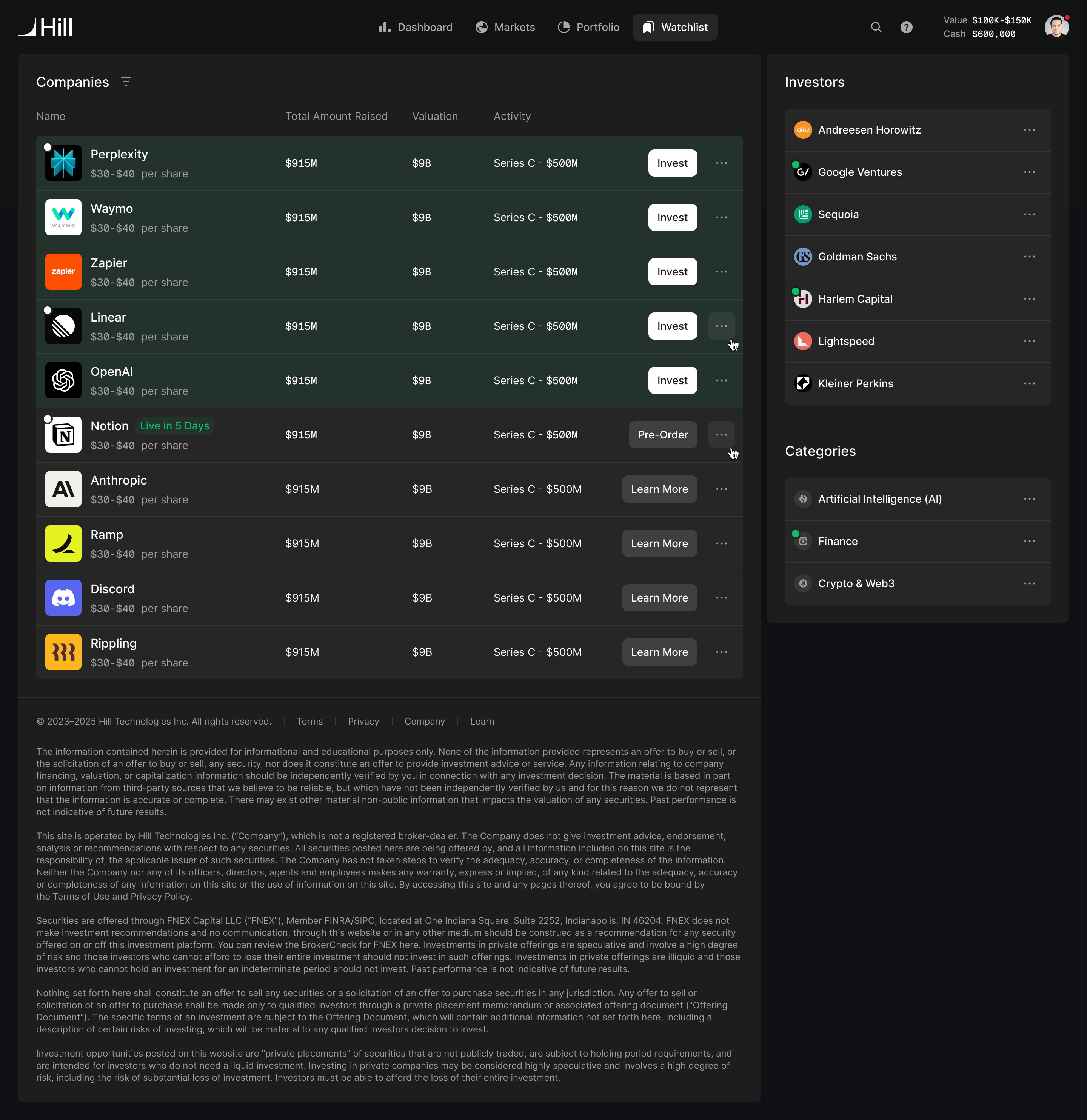List of companies with detailed investment statistics, including total amount raised, valuation, and activity. Features interactive options like investing and pre-ordering.