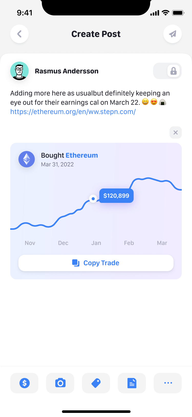 A post creation screen for a socialized crypto app where users can share updates and insights. The screen features a graph card displaying Ethereum trading data, a user comment section, and action buttons.