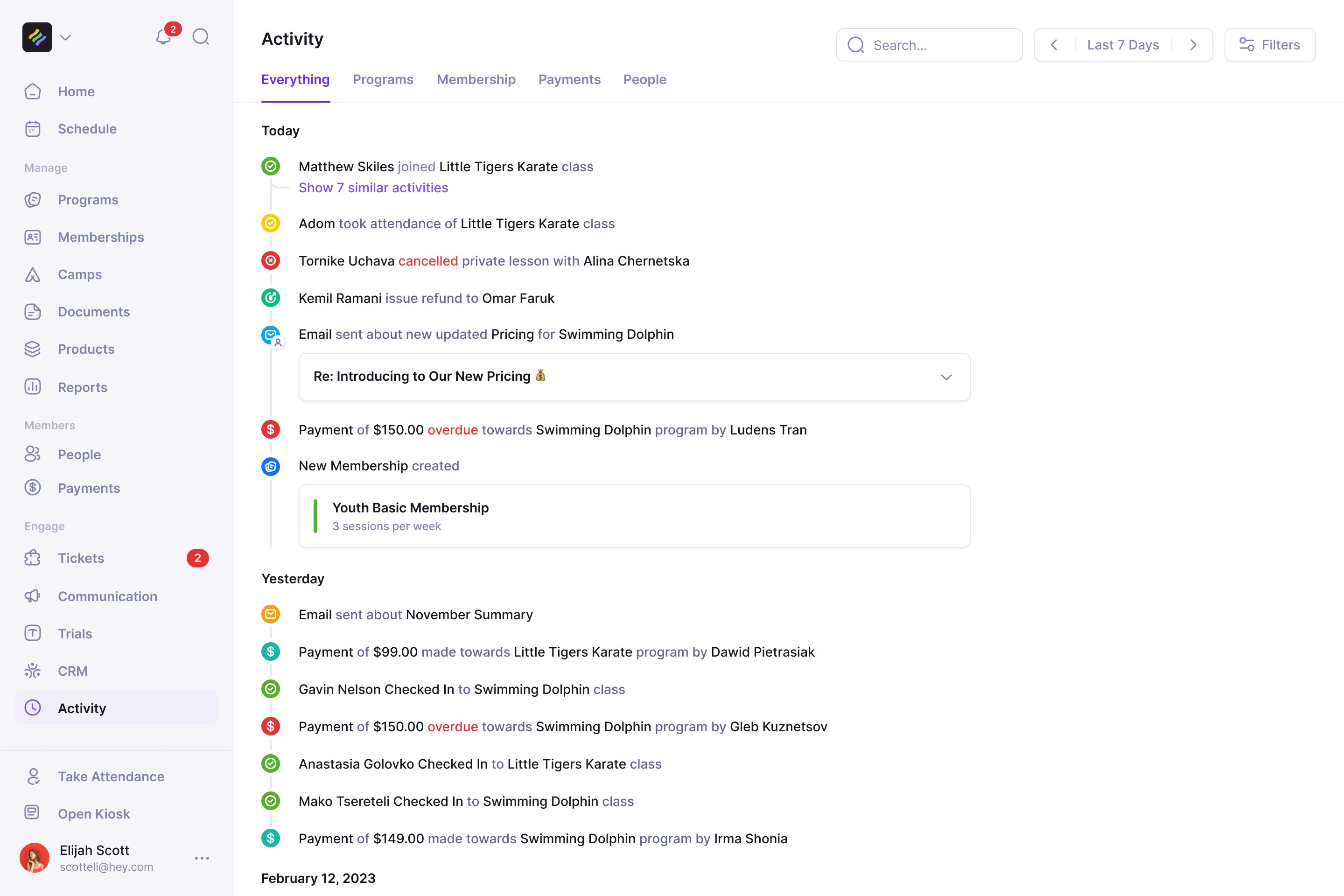 The Activity Log allows you to track member activities with filters, a search bar, and a side navigation panel. It displays recent interactions and financial transactions.