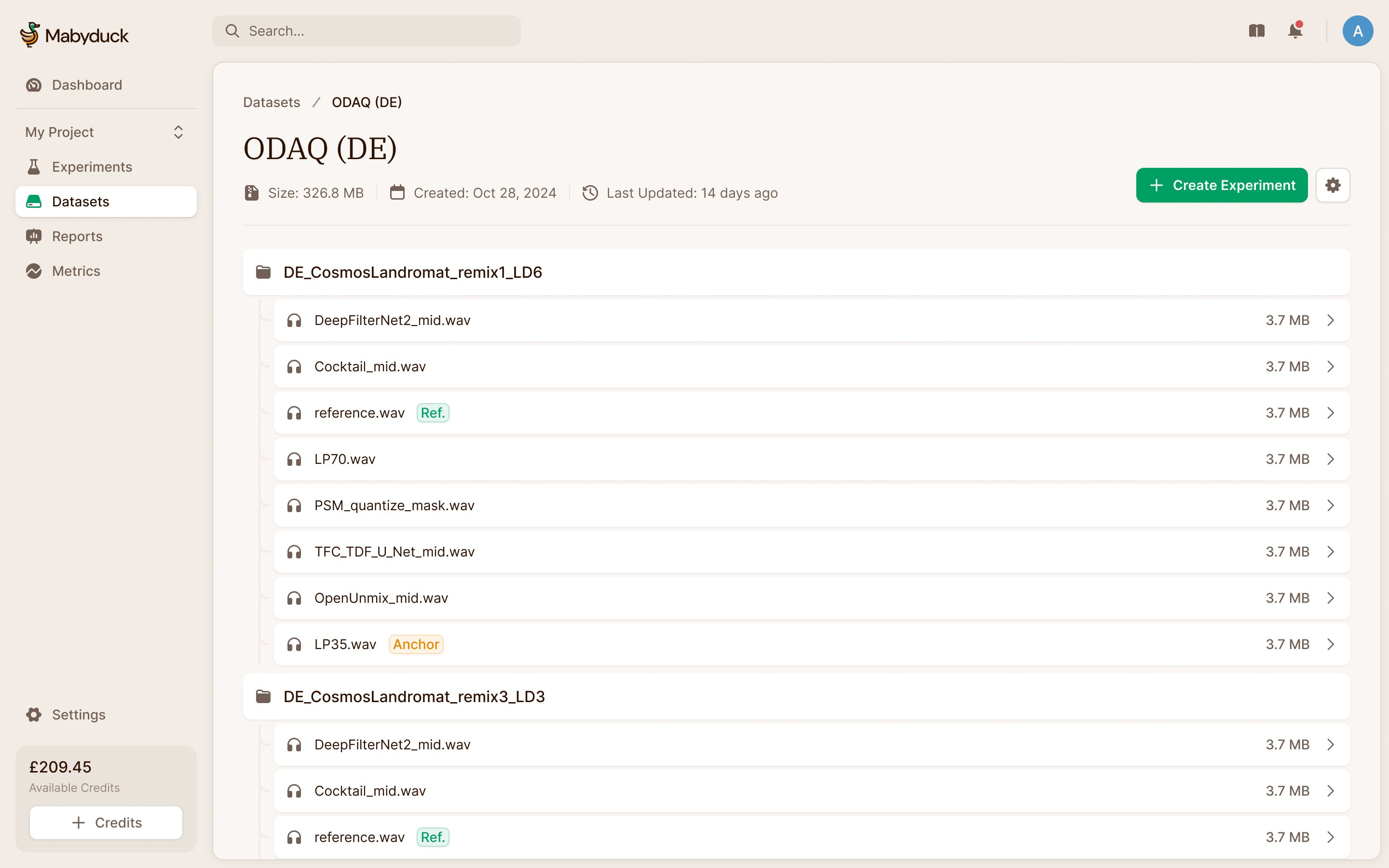 A clean interface for managing datasets with a sidebar for navigation, dataset details such as size and date, and options to create experiments. Files are listed with their size and additional tags.