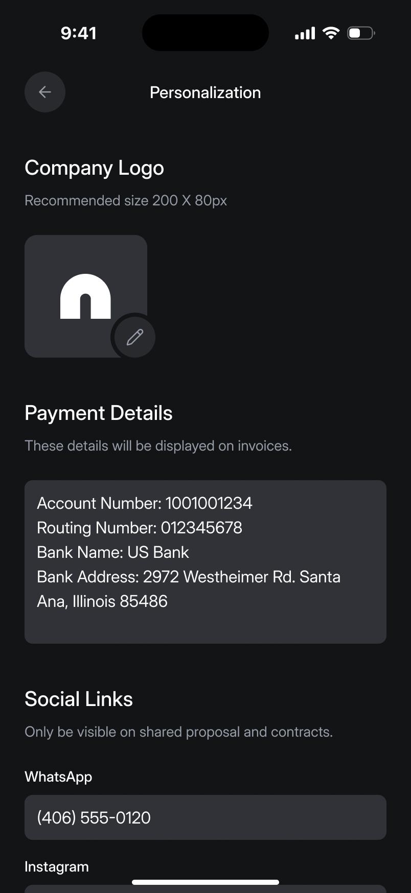 A mobile view for personalizing a company profile, including logo upload and payment details input. The screen shows a section for social links that can be shared on proposals and contracts.