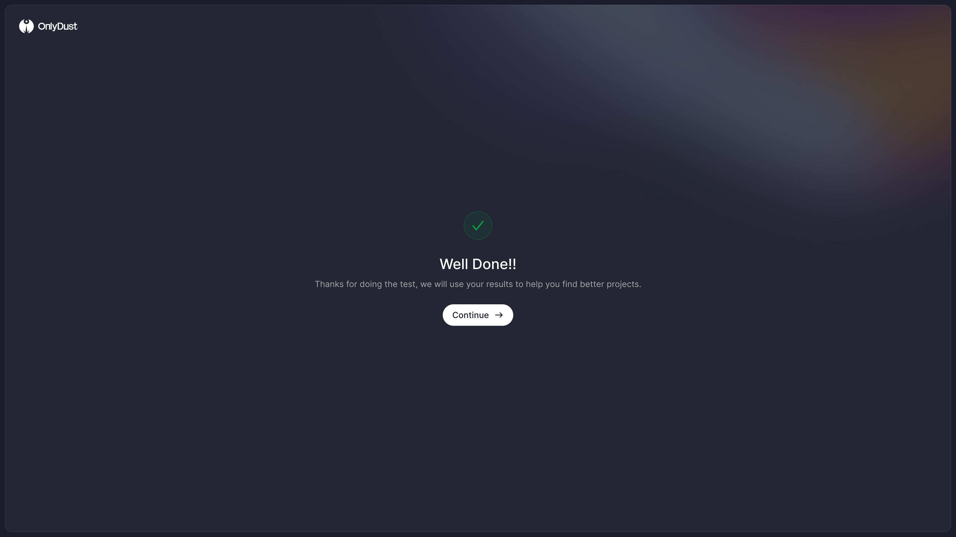 A dark-themed success screen with a checkmark icon and a message indicating task completion. Includes a 'Continue' button.