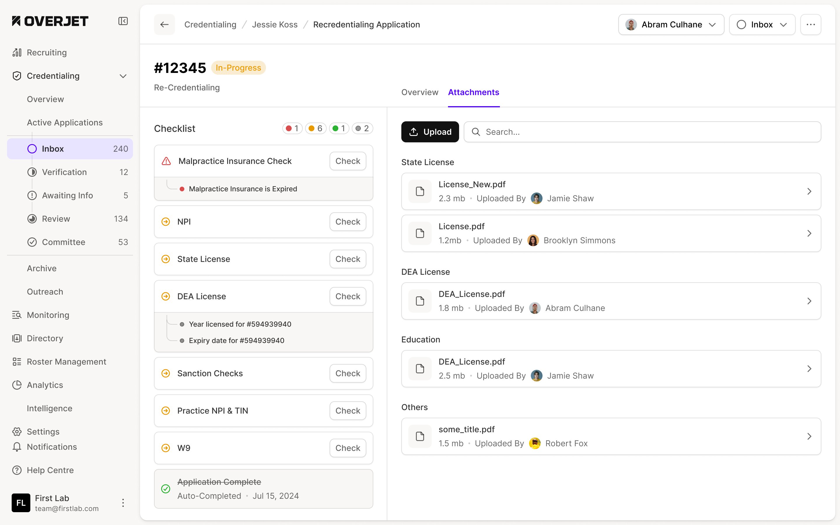 A credentialing application interface with a sidebar menu and a focus on document attachments and checklist tasks for re-credentialing.