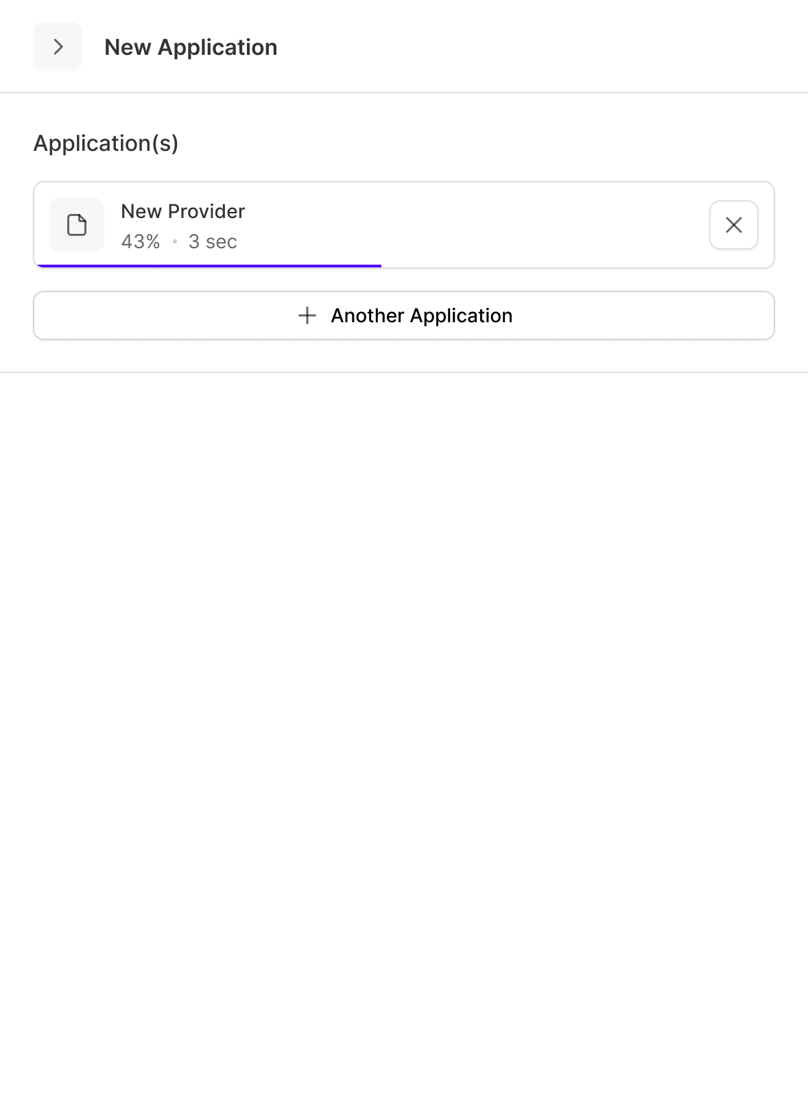 A minimalistic card interface showing the progress of a new provider application.