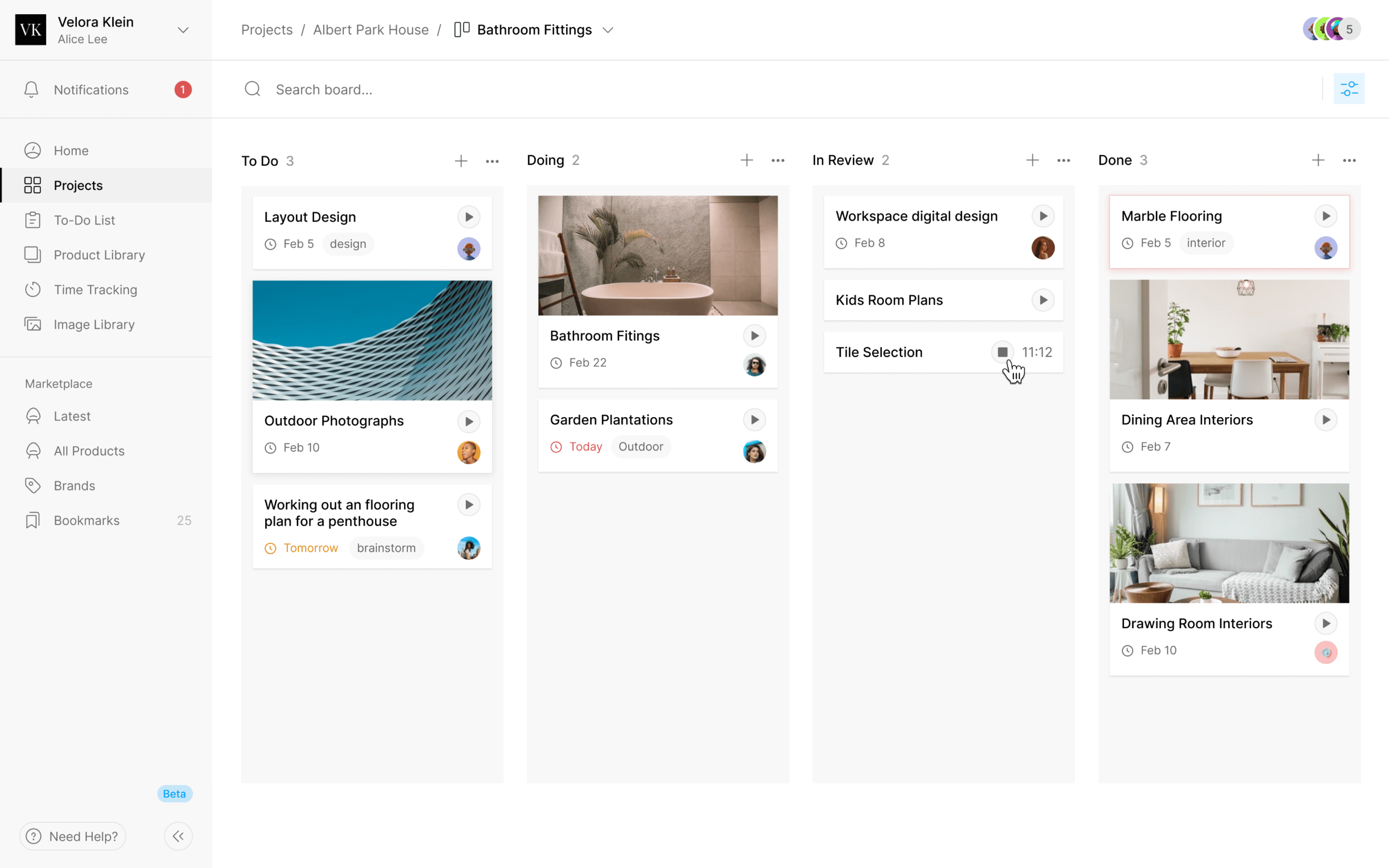 A task management interface with a kanban board layout displaying tasks in columns such as To Do, Doing, In Review, and Done. The sidebar contains navigation options like Projects and To-Do List.