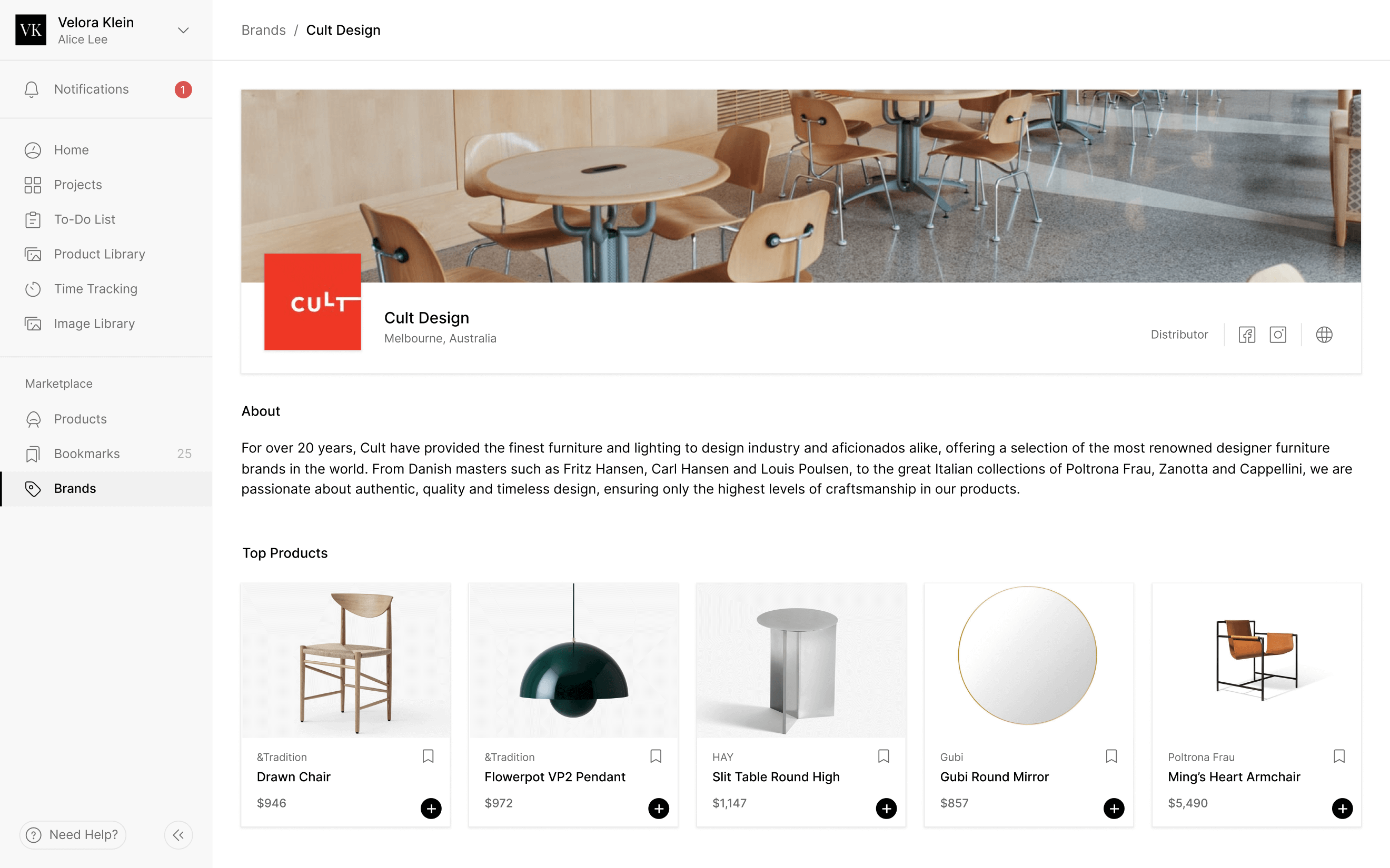 Product page featuring a brand with a list of top products displayed in a card layout, including images and price points. The interface includes a sidebar for navigation.