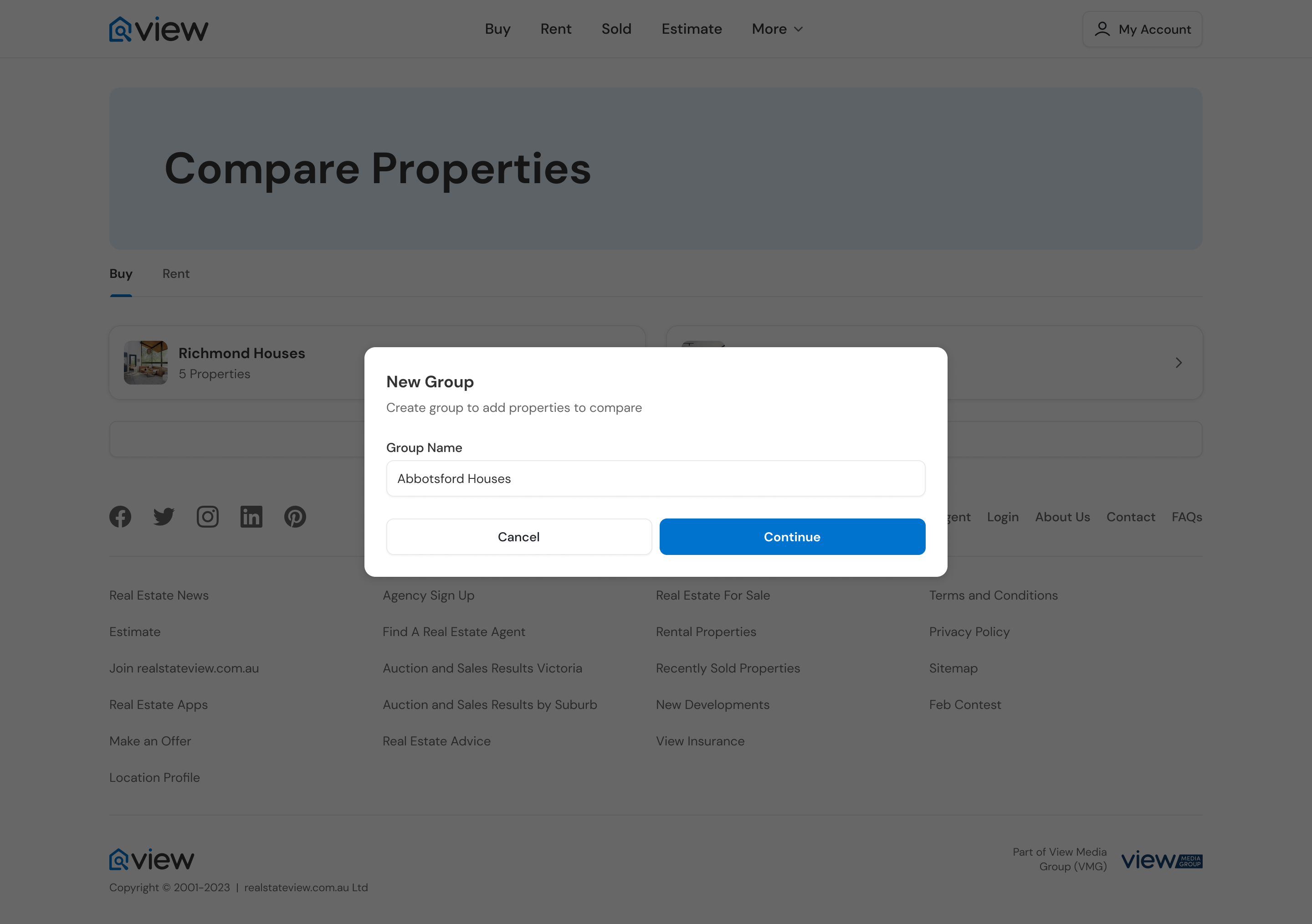 A modal for creating a new group to add properties for comparison, featuring a text input for group name and options to cancel or continue.