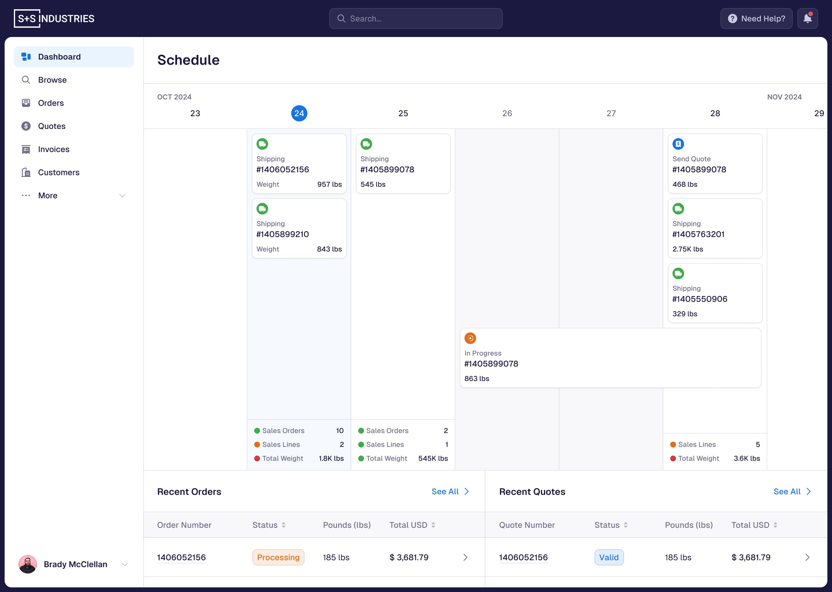 A calendar-focused interface showing a weekly schedule with shipping details and a sidebar navigation menu. It includes recent orders and quotes sections at the bottom.