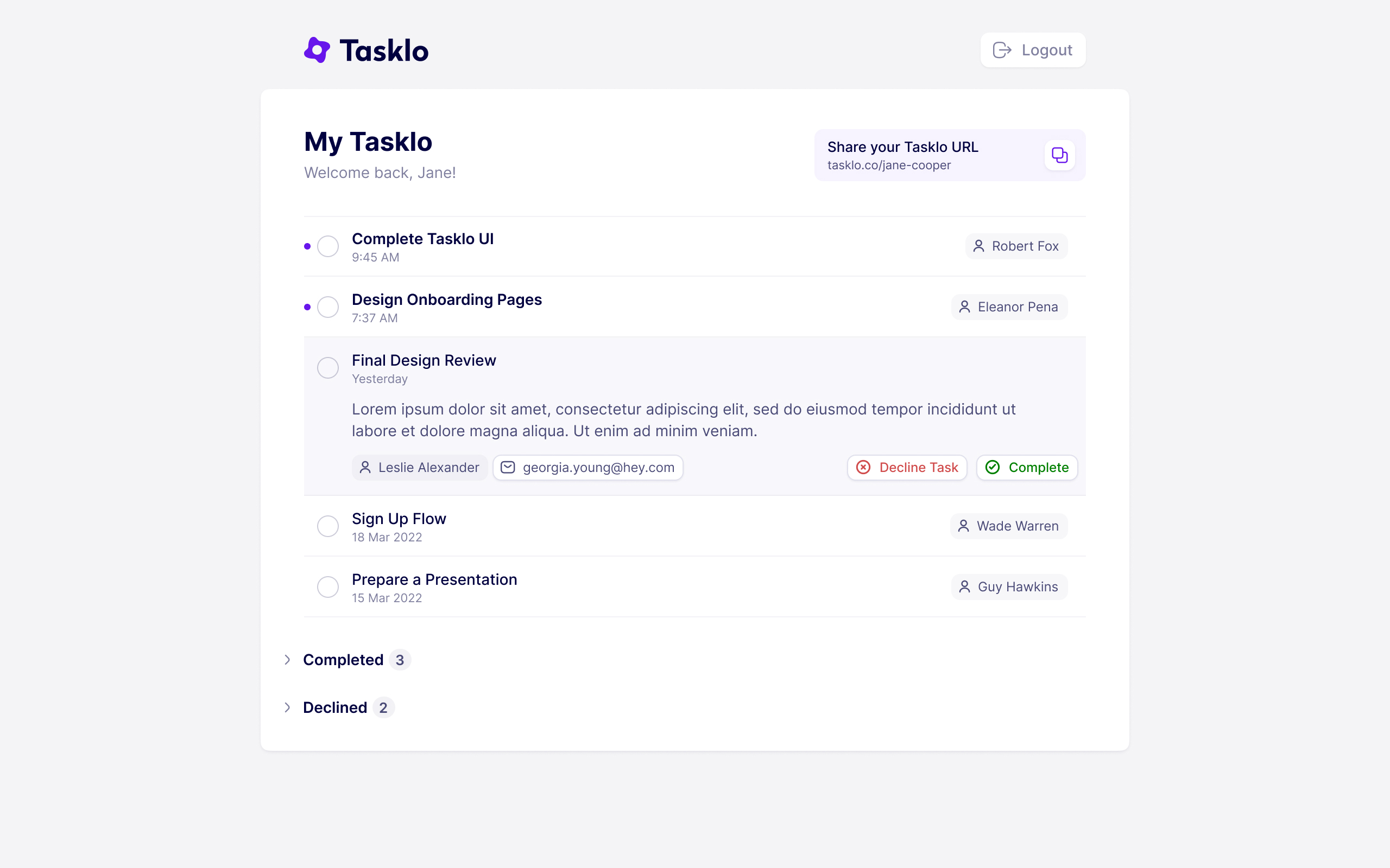 A todo list interface showcasing tasks with options to complete or decline. Features a user profile area with task sharing functionality.