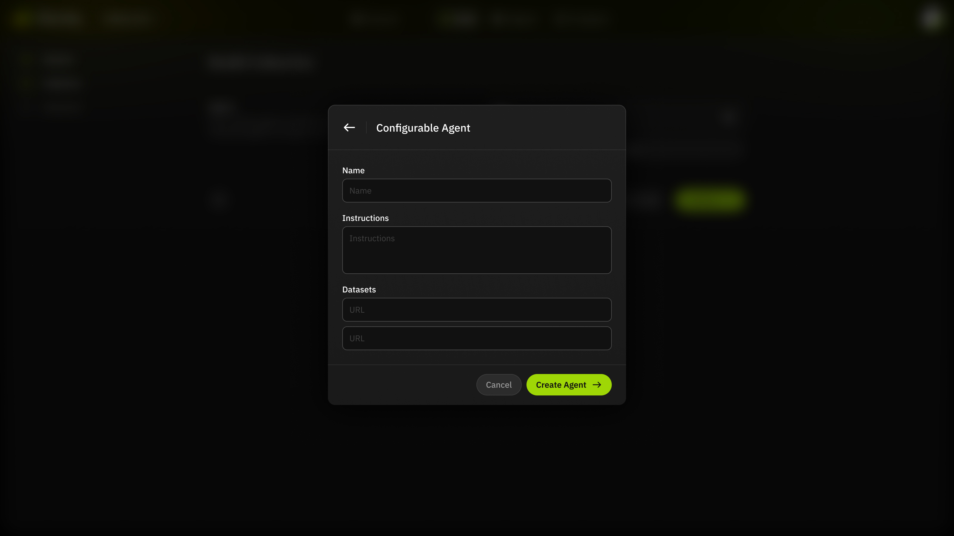 A dark themed popup for a configurable agent creation with input fields for name, instructions, and dataset URLs. It includes cancel and create buttons.