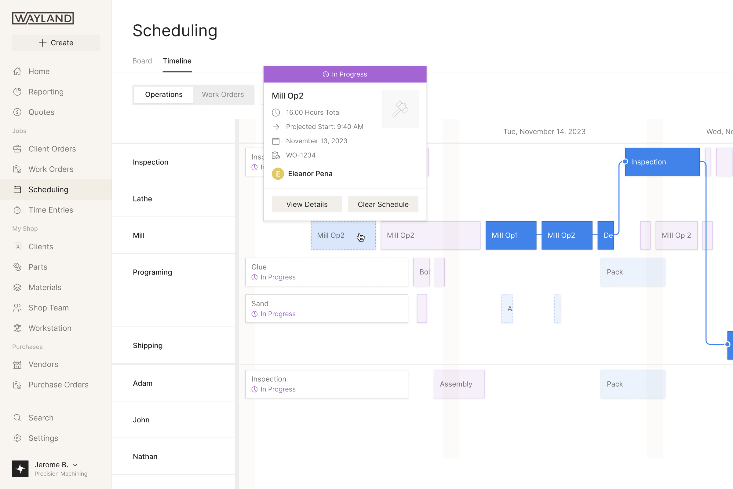 A timeline view in a machine shop management application featuring a popup modal showing detailed information about a scheduled operation, including the status, projected start time, and assigned personnel.