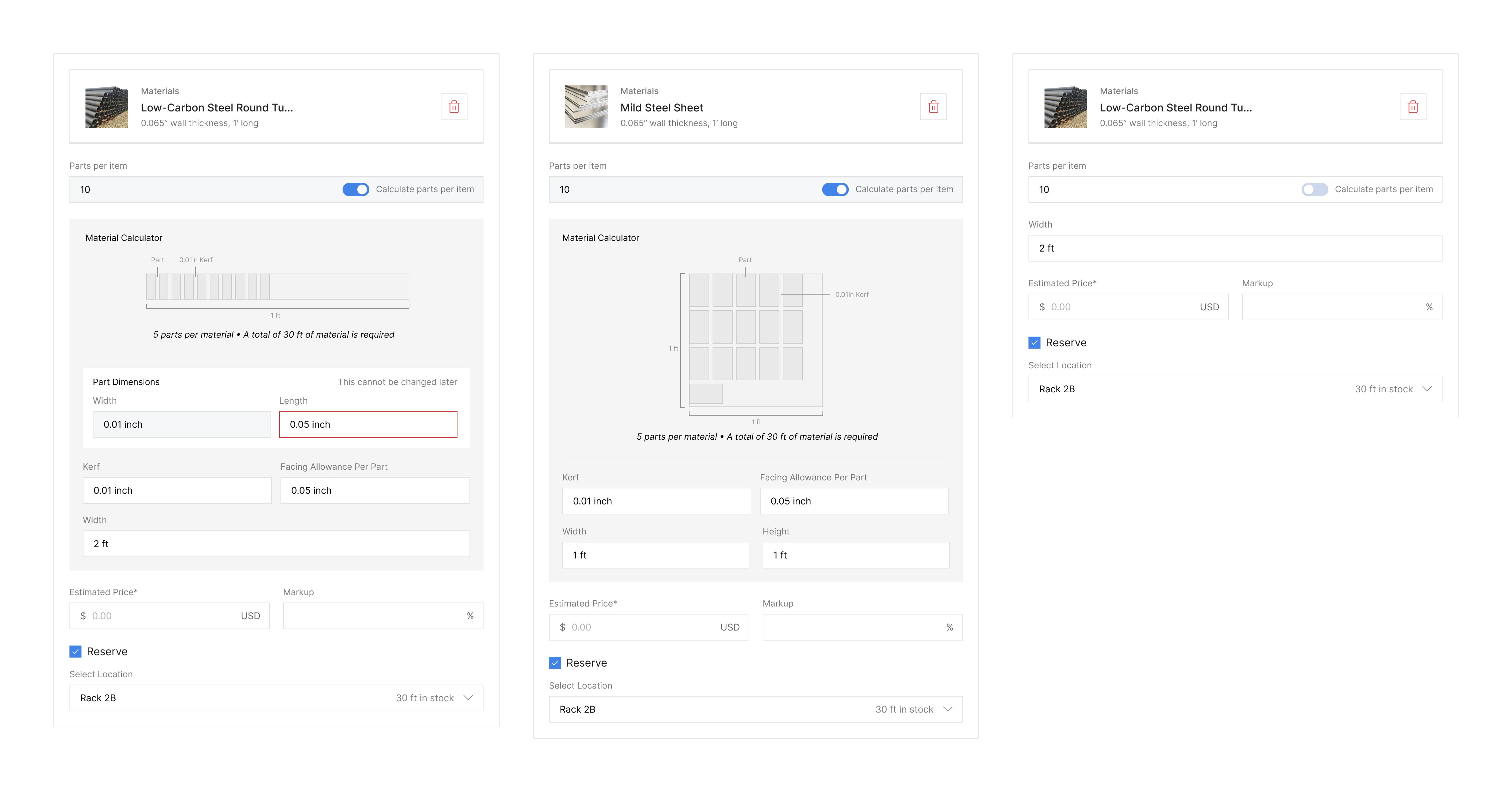 A material calculation interface for selecting and calculating material requirements in a machine shop setting.