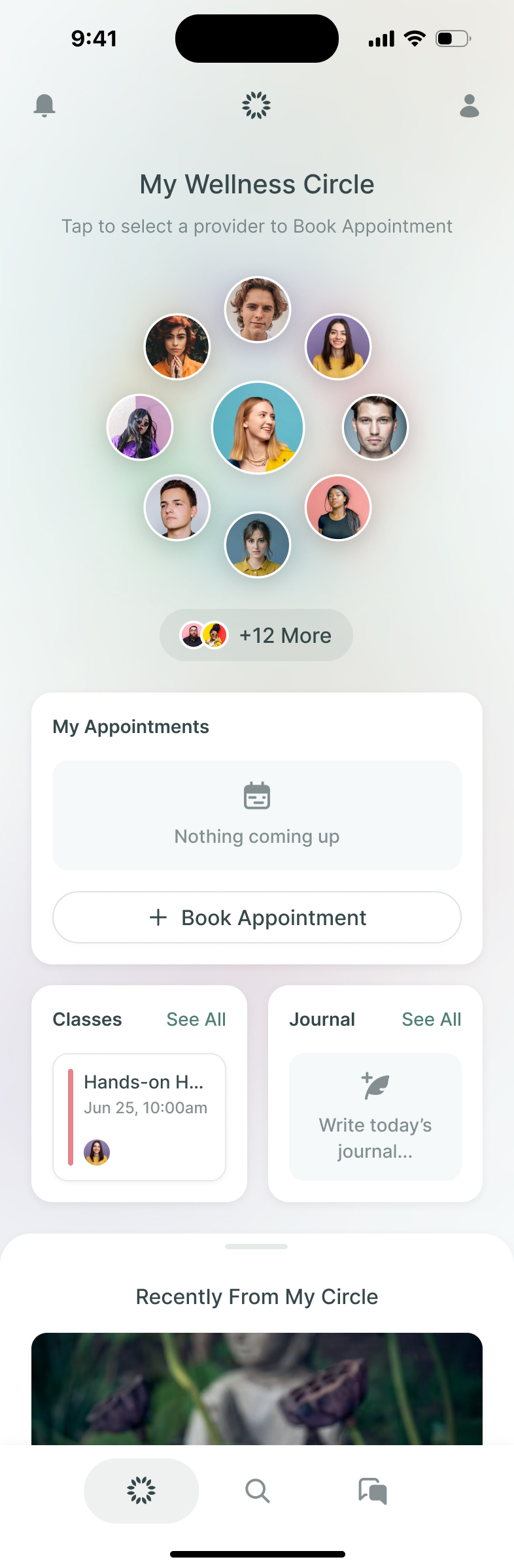 A mobile interface from a wellness app featuring user avatars in a circular layout, with options to see more providers, book appointments, and access classes and journals.