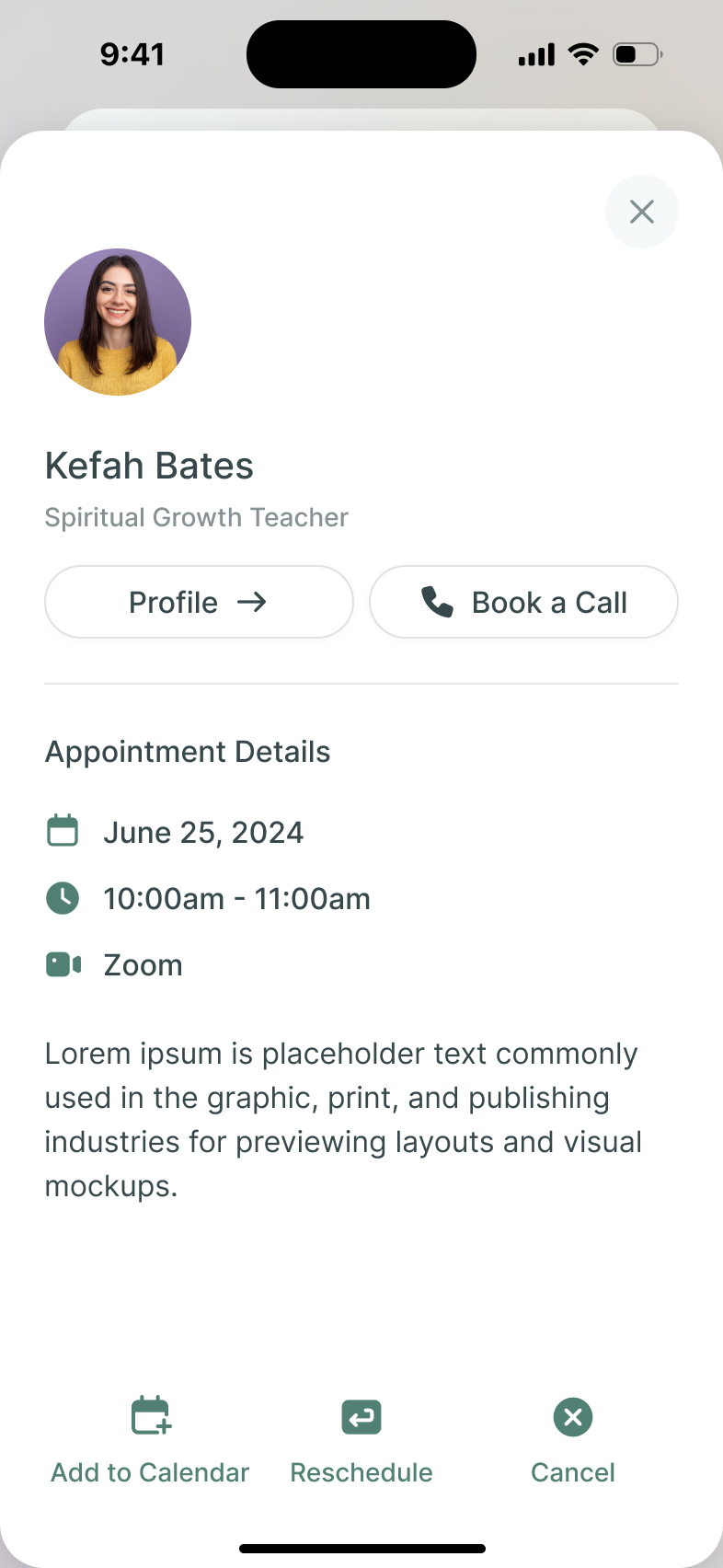 A mobile web interface showing appointment details with options to add to calendar, reschedule, or cancel. Includes a profile button, book a call option, and appointment specifics like date, time, and location.