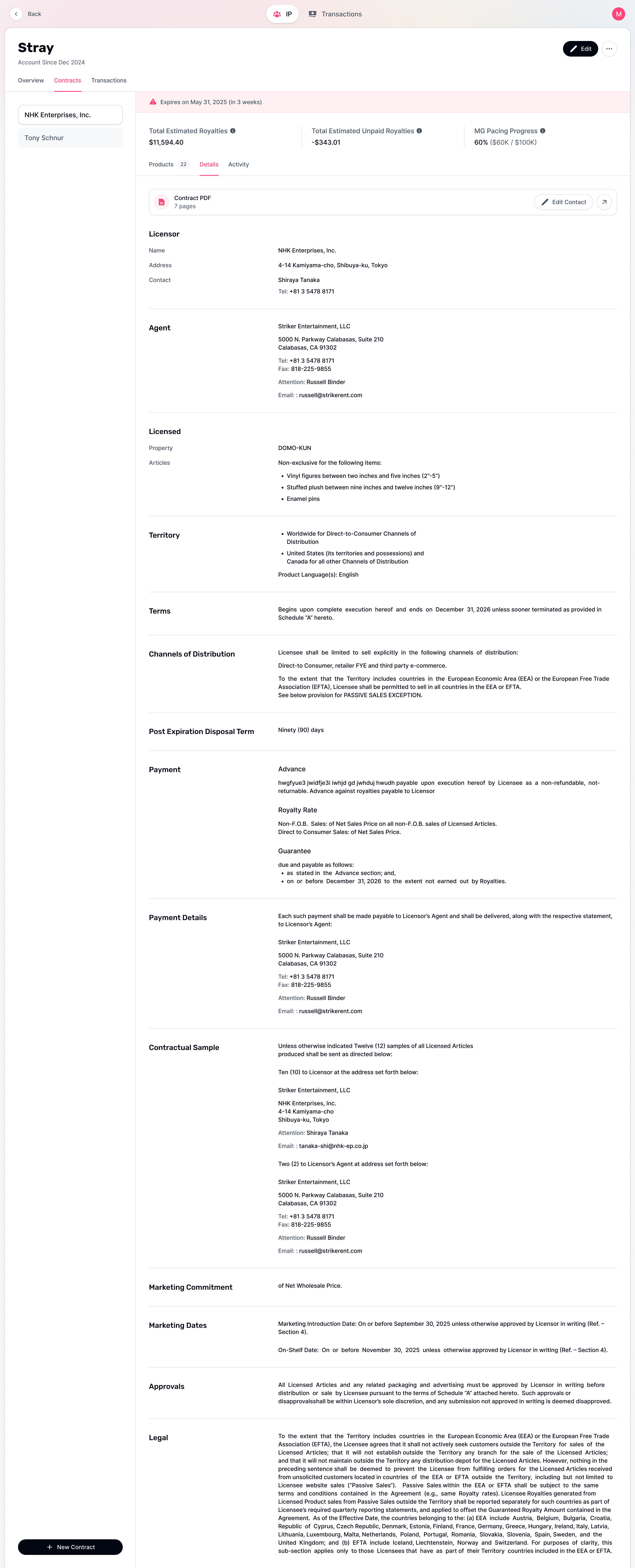 An overview screen showing contract details with a sidebar menu. The screen includes financial summaries, contact details, and legal information related to transactions.