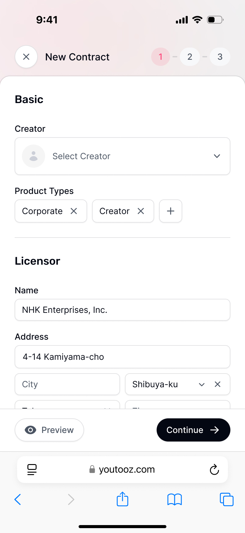 A mobile web interface for creating a new contract, featuring a step indicator at the top, dropdowns for selecting creator and licensor information, and options for adding product types.