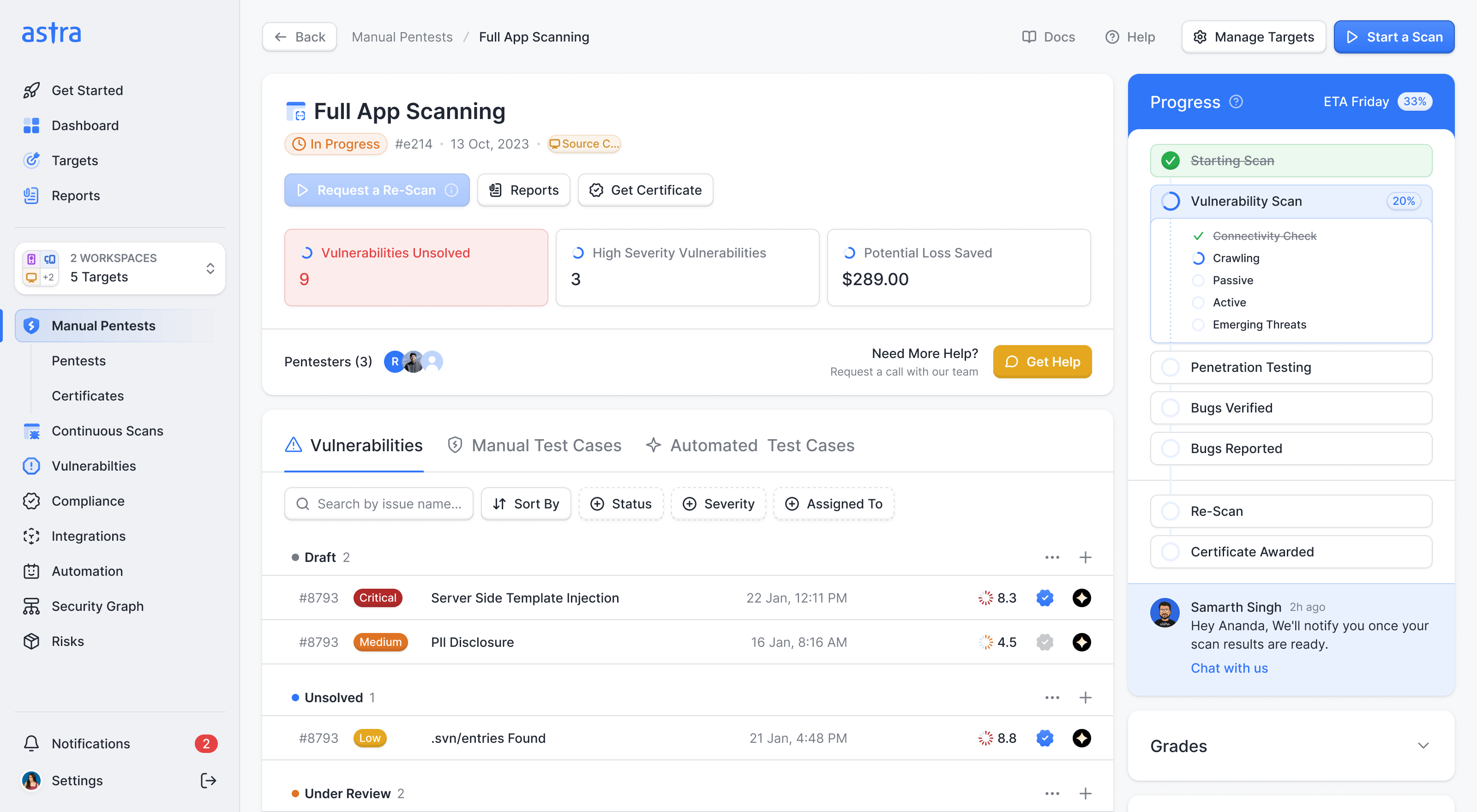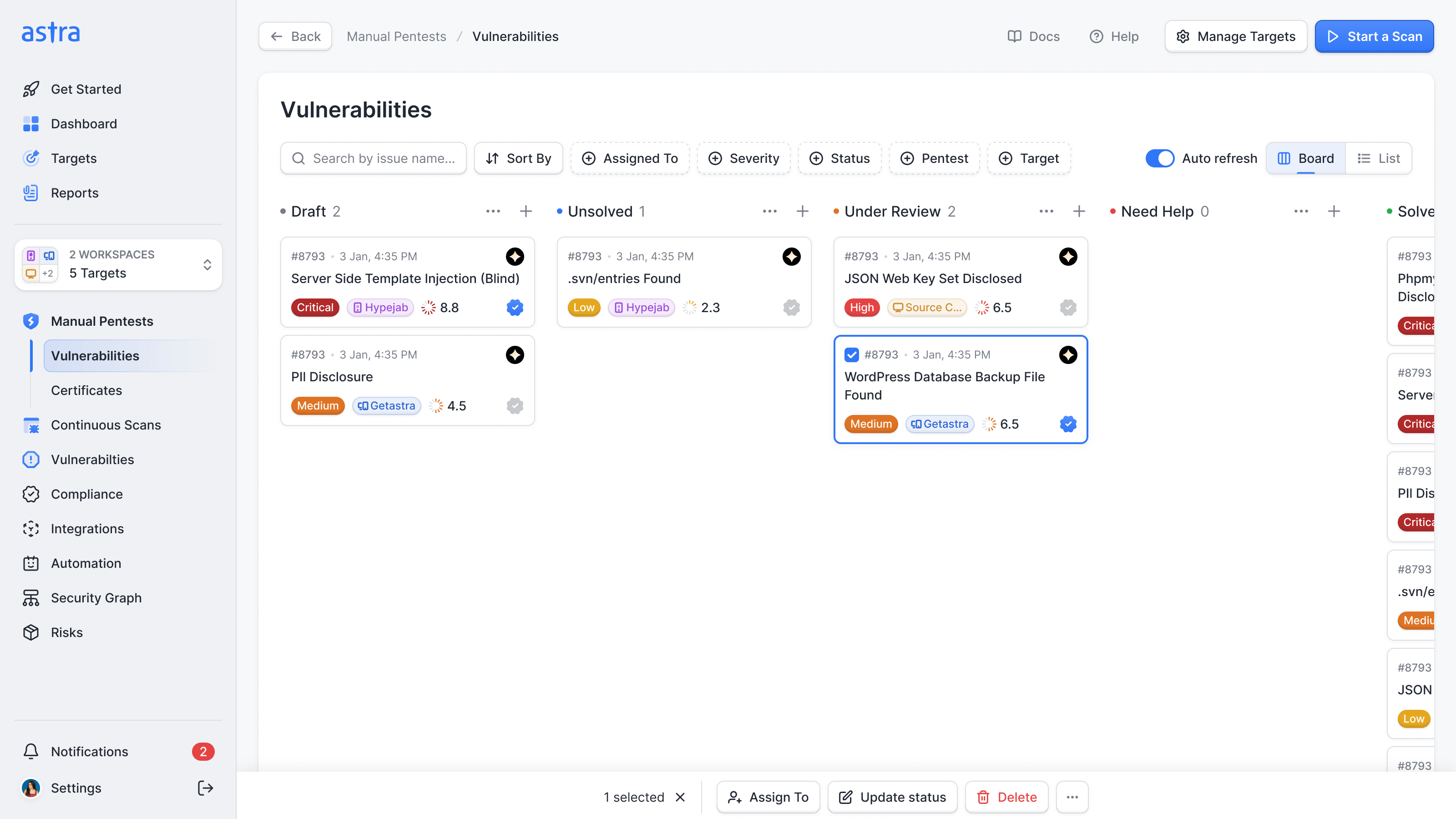 We partnered with Astra over the course of two months, to totally redesign their leading penetration testing platform. This included a visual overhaul but also performing a major re-architecture of the core user experience.