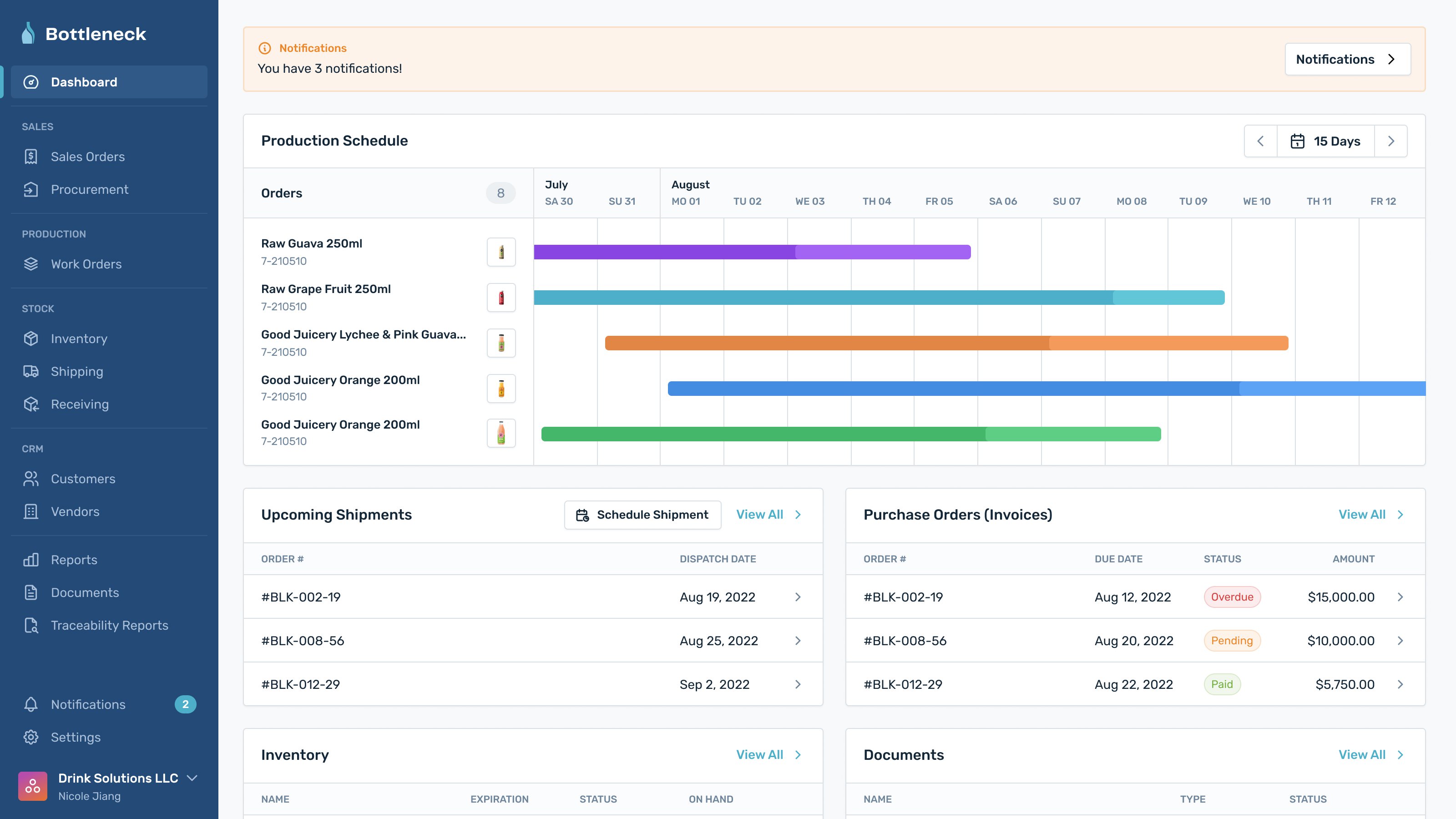 A supply chain overview screen displaying a production schedule with a Gantt chart, upcoming shipments, and purchase orders. The layout includes a sidebar for navigation and notifications at the top.