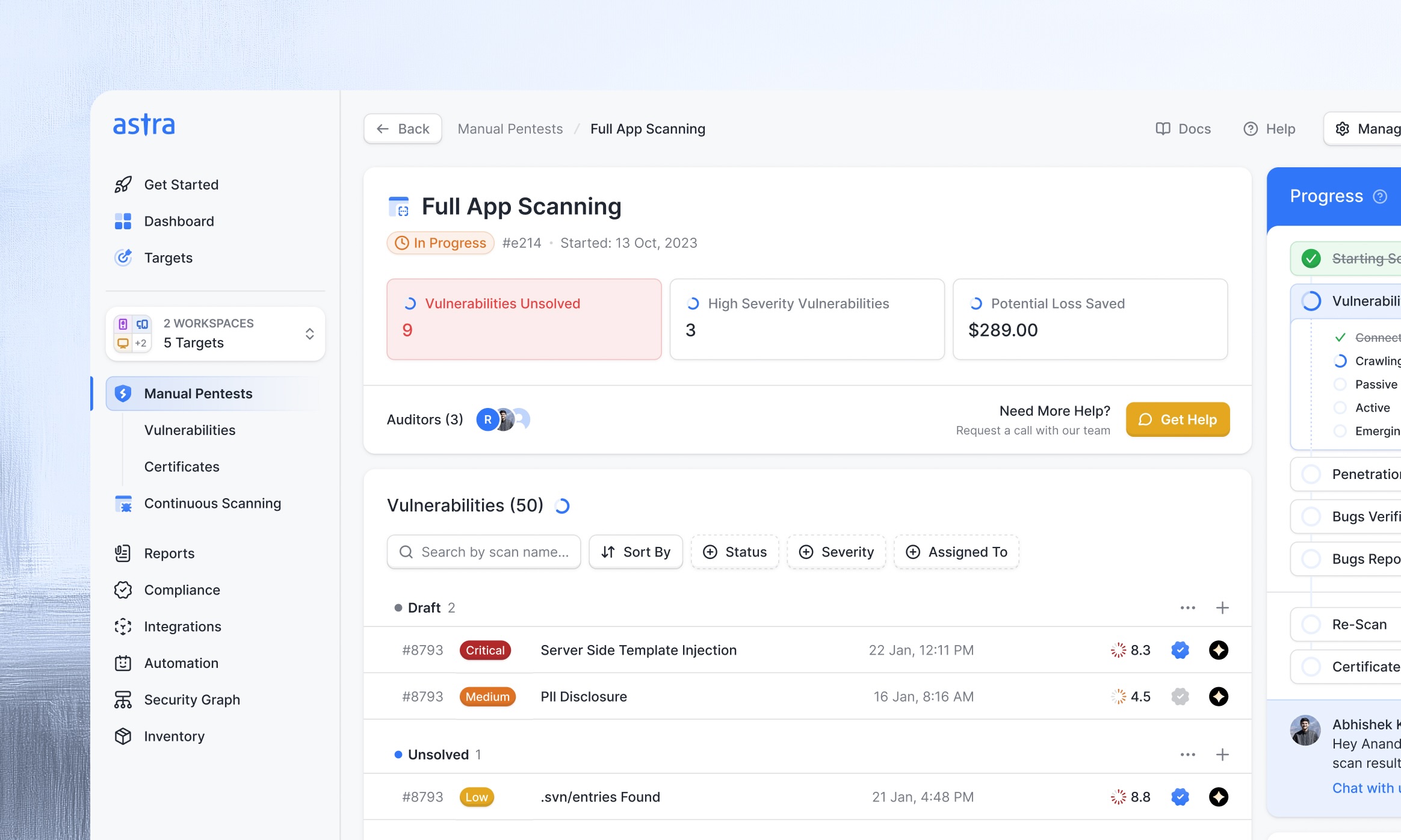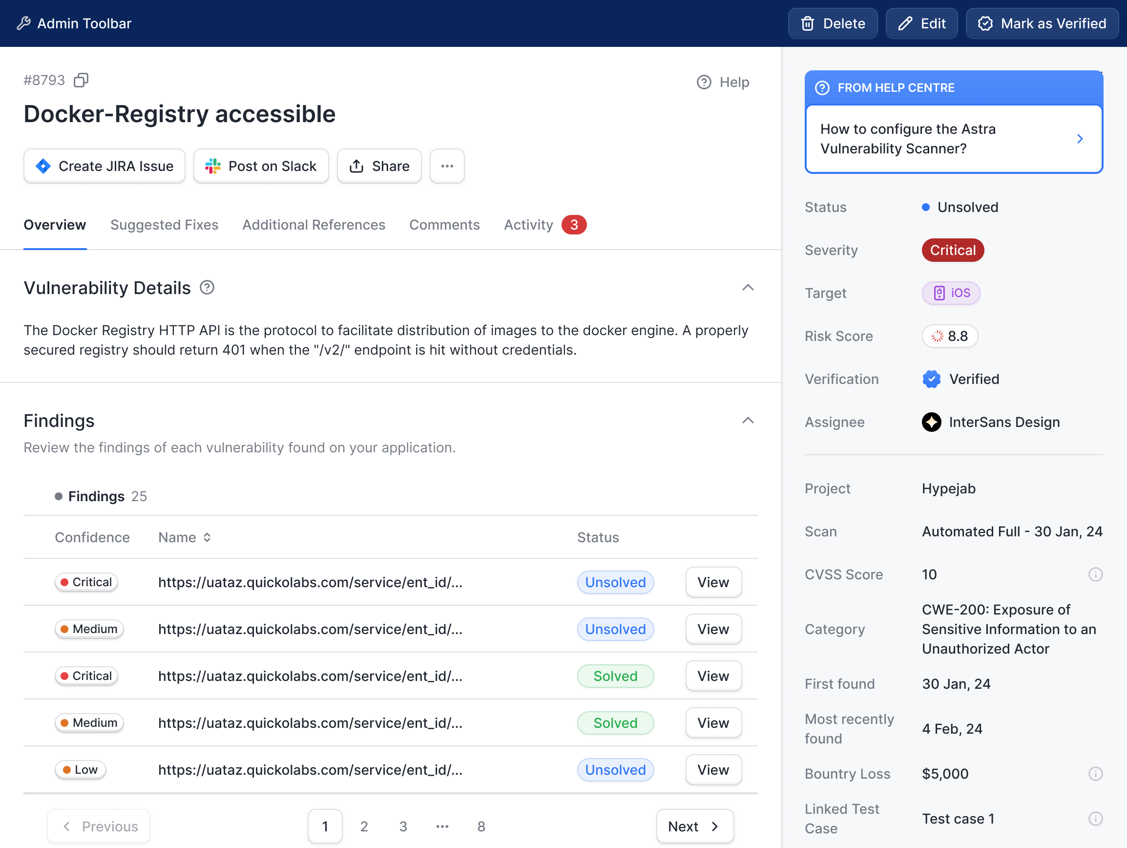 We partnered with Astra over the course of two months, to totally redesign their leading penetration testing platform. This included a visual overhaul but also performing a major re-architecture of the core user experience.